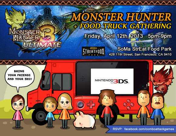 This Friday,  April 12, from 5pm to 9pm PT there’s the  Monster Hunter + Food Truck Gathering at the SoMa StrEat Food Park in San Francisco! The address is 428 11th Street, San Francisco, CA. They also have a Facebook page, where you can RSVP for the event .